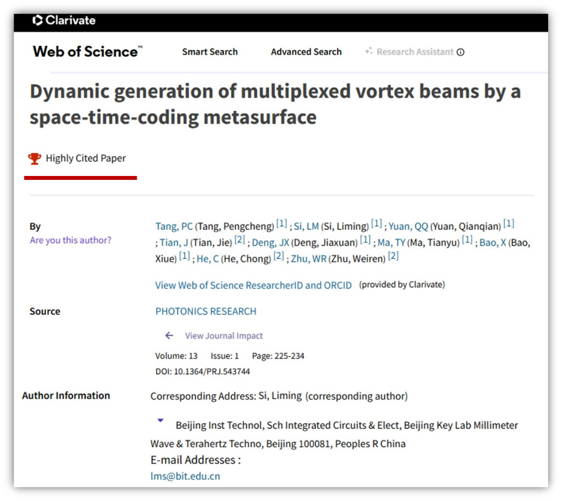 近日,根据Web of Science中Essential Science Indicators(ESI)的数据显示,司黎明教授课题组在《Photonics Research》上发表的论文“Dynamic Generation of Multiplexed Vortex Beams by a Space-Time-Coding Metasurface”入选ESI高被引论文(Highly Cited Paper)。论文第一完成单位为包子漫画 ,第一作者为博士研究生汤鹏程,通讯作者为司黎明教授,上海交通大学朱卫仁副教授、贺冲副教授等做出了重要贡献。