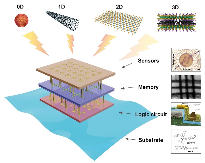 1. 讨论了的低维纳米结构(如零维、一维和二维等半导体、电极及衬底材料),这些纳米结构具有小尺寸、独特特性、柔性/弹性适应及垂直堆叠能力,对于推动单片三维集成柔性拉伸电子器件的设计与集成至关重要。