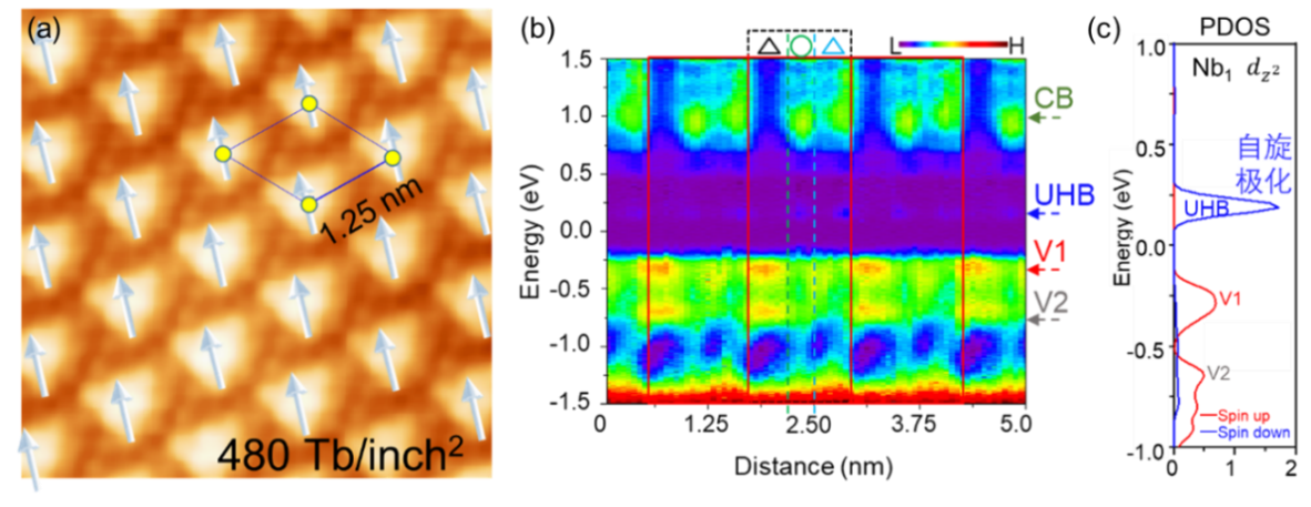 轨道之间的空间反相分布关系,测量并阐明了单层1T-NbSe2每个CDW格点在UHB态的能量具有自旋极化特性,可作为低功耗的信息存储点。信息点间距为1.25nm,自旋信息存储密度高达480 Tb/inch2 (每平方英寸480兆兆比特)。