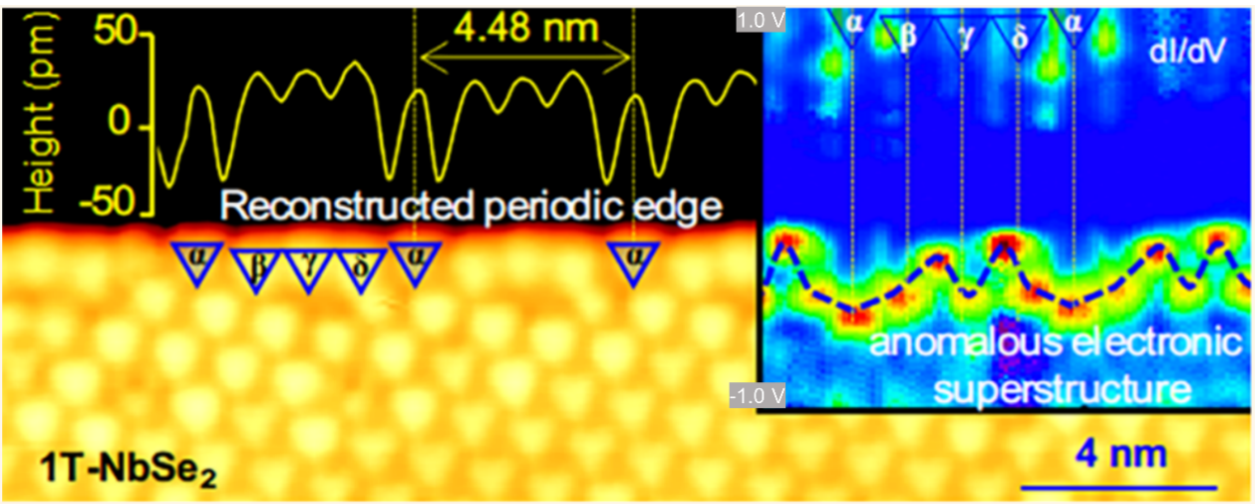 利用分子束外延(MBE)技术构筑了原子级平整边界,发现边界处的CDW元胞由体内有序的CDW晶格自发地演化重构成四聚体。此外,还发现沿边界出现了反常的电子超结构,其周期是普通CDW晶格的4倍。每个周期由4个不等价CDW组成,并呈现由结构调制的相应电子态超结构,实现了对自旋阵列尺寸和维度的深入调控。