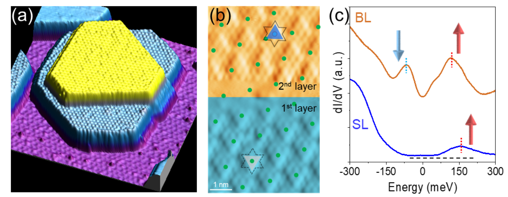 图4. (a)双层转角叠层结构的三维形貌图。(b)双层形貌的原子分辨图。(c)单双层NbSe2的微分电导谱,零偏压附近的两个电子态分别呈现出向上和向下的自旋,与单层相比,双层的自旋信号明显加强。