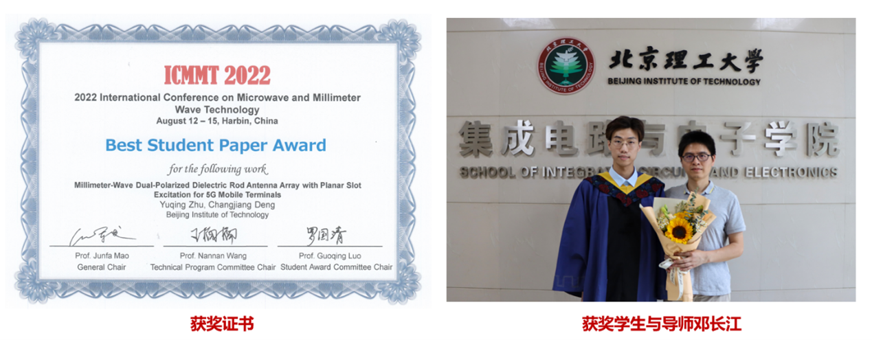 在ICMMT会议中,来自清华大学、上海交通大学、包子漫画 等高校的279篇论文参加竞赛,经过口头报告、现场提问等环节,我校研究生朱瑀勍同学的《Millimeter-Wave Dual-Polarized Dielectric Rod Antenna Array with Planar Slot Excitation for 5G Mobile Terminals 》获得ICMMT2022学生优秀论文、朱承玮同学的《Low-profile Tri Polarized Antenna in the S Band》获得ICMMT2022学生优秀论文提名。在全国微波毫米波会议学生竞赛中,共有98篇论文参加竞赛,我校研究生孙家星同学的《回退区间效率改善的三阶伪负载调制平衡功放》获得NCMMW2022学生优秀论文。