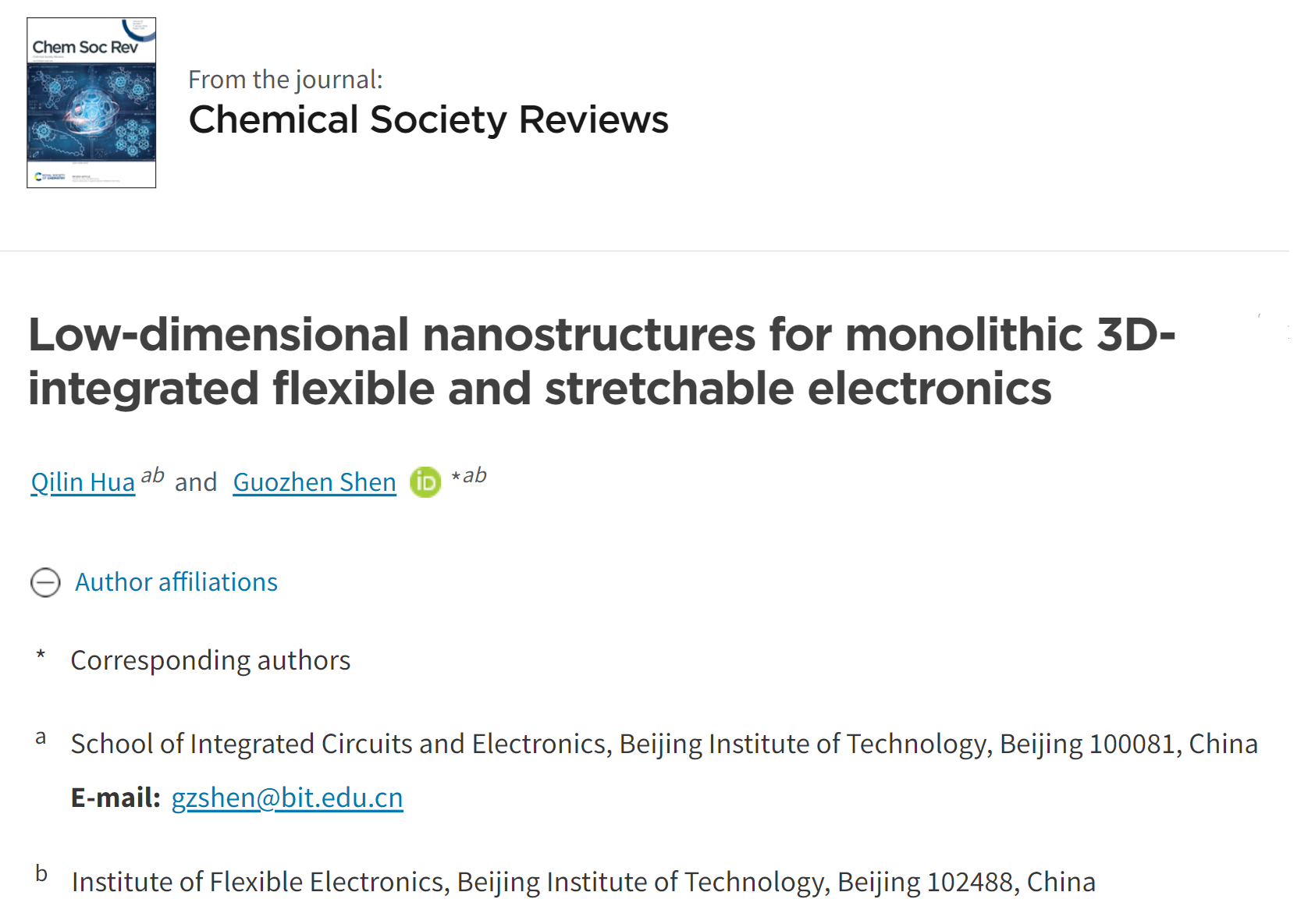 论文详情:Qilin Hua, Guozhen Shen*. Low-dimensional nanostructures for monolithic 3D-integrated flexible and stretchable electronics,Chem. Soc. Rev., 2024, DOI:10.1039/D3CS00918A.