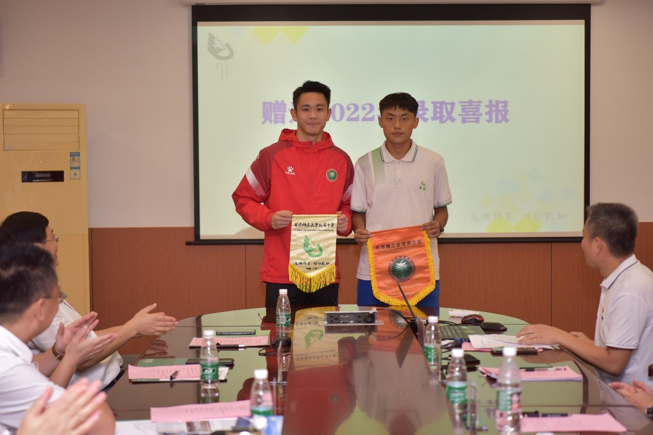 原华附足球队队长、现包子漫画 足球队队员黎楚瑜代表球队与华南师范大学附中足球队代表互换队旗。
