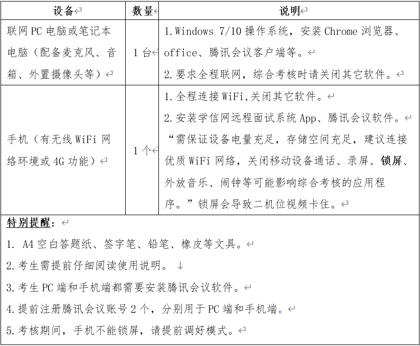 为确保考核过程系统顺畅,学院将组织考生对考核系统提前进行测试。考生需提前做好远程网络视频软硬件设备的准备,并按学院配合完成系统测试。学院将依据考生预留的联系方式进行联络,请考生保持电话畅通,并及时查收邮件。考核正式开始时,考生须通过视频设备协助考核专家对周边环境进行360度无死角检查。